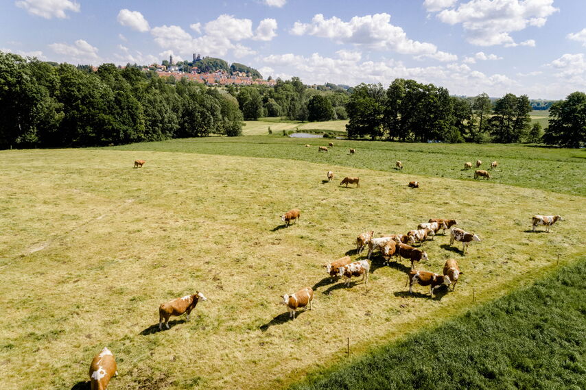 - Extensive Weidehaltung des Simmentaler Fleckviehs und der Angus-Rinder mindestens von Mai bis Oktober (im Winter Haltung in mit Stroh ausgelegten Laufställen)